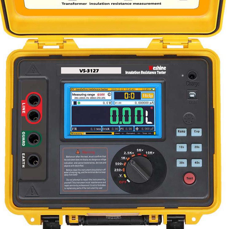 Weshine® VS-3127 es un dispositivo alimentado por bateríaPrueba de aislamiento del transformadorcon pantalla de arco digital y analógica, diseñado para pruebas de resistencia de aislamiento de alto voltaje en el mantenimiento y reparación de cables, maquinaria de plantas rotativas, transformadores, aparamenta y aplicaciones industriales.