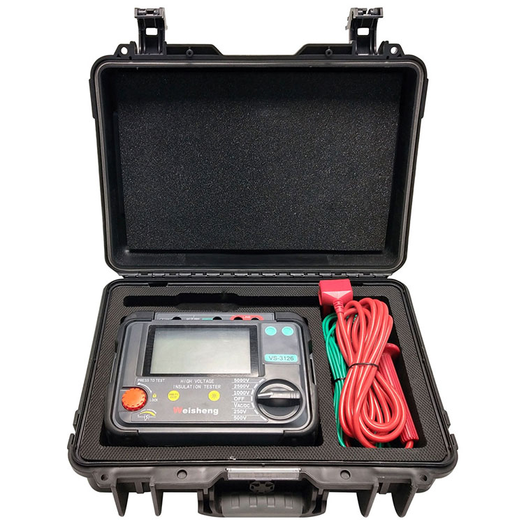 VS-3127 El VS-3127Probador de aislamiento 500Vofrece la capacidad de realizar mediciones precisas de resistencia de aislamiento de hasta 15 kV de tensión de prueba con una resistencia máxima de 30 TΩ. ¡La precisión de la medición de la resistencia es de ± 5 % de 1 MΩ a 3 TΩ! Para las empresas de servicios públicos y de servicios, el VS-3127 es un probador versátil con su flexibilidad y capacidad de prueba futura. El Weshine VS-3127 está diseñado para funcionar dondequiera que trabaje. Voltaje nominal de salida máximo alcance 7 engranajes (250Vï¼500Vï¼1KVï¼2.5KVï¼5KVï¼10KVï¼15KV). Corriente máxima de cortocircuito 7mA Prueba de resistencia de aislamiento (IR), prueba de índice de polarización ï¼PI), prueba de relación de absorción dieléctrica (DAR). Modo de prueba de rampa (RAMP), modo de prueba de resistencia filtrada (FR). *Prueba de capacitancia (Cap.). Función de monitor de voltaje, monitoreando automáticamente el voltaje vivo del medido